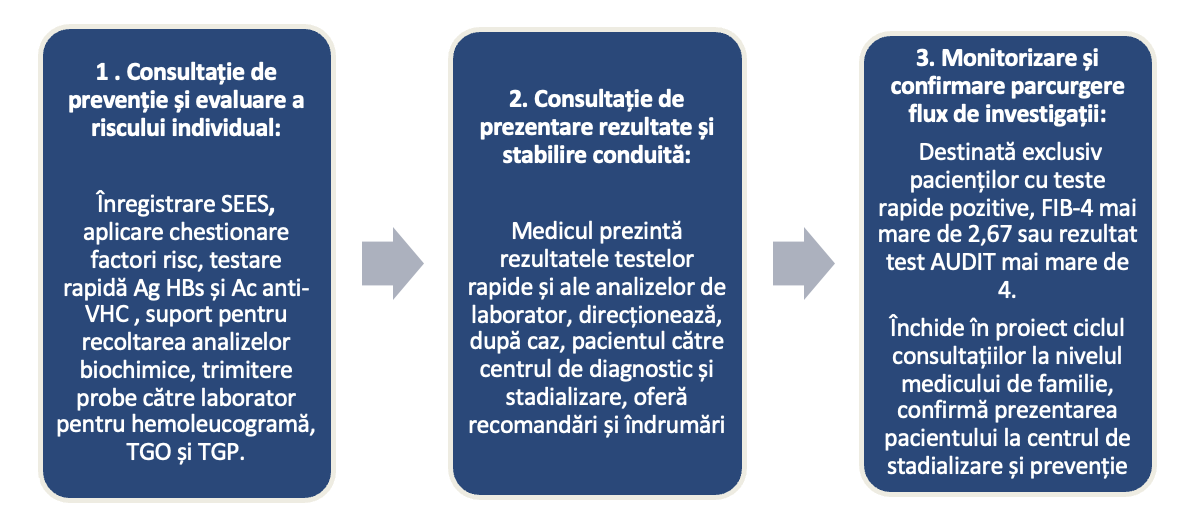 Consultația 3 – Monitorizare și confirmare parcurgere flux de investigații: este destinată exclusiv pacienților cu teste rapide pozitive, FIB-4 mai mare de 2,67 sau rezultat test AUDIT mai mare de 4. Această consultație asigură închiderea buclei de monitorizare la nivelul medicului de familie, confirmă prezentarea pacientului la centrul de stadializare și prevenție și eficientizează comunicarea rezultatelor investigațiilor, asigurând astfel că pacientul nu se pierde pe traseu între screening și diagnostic.